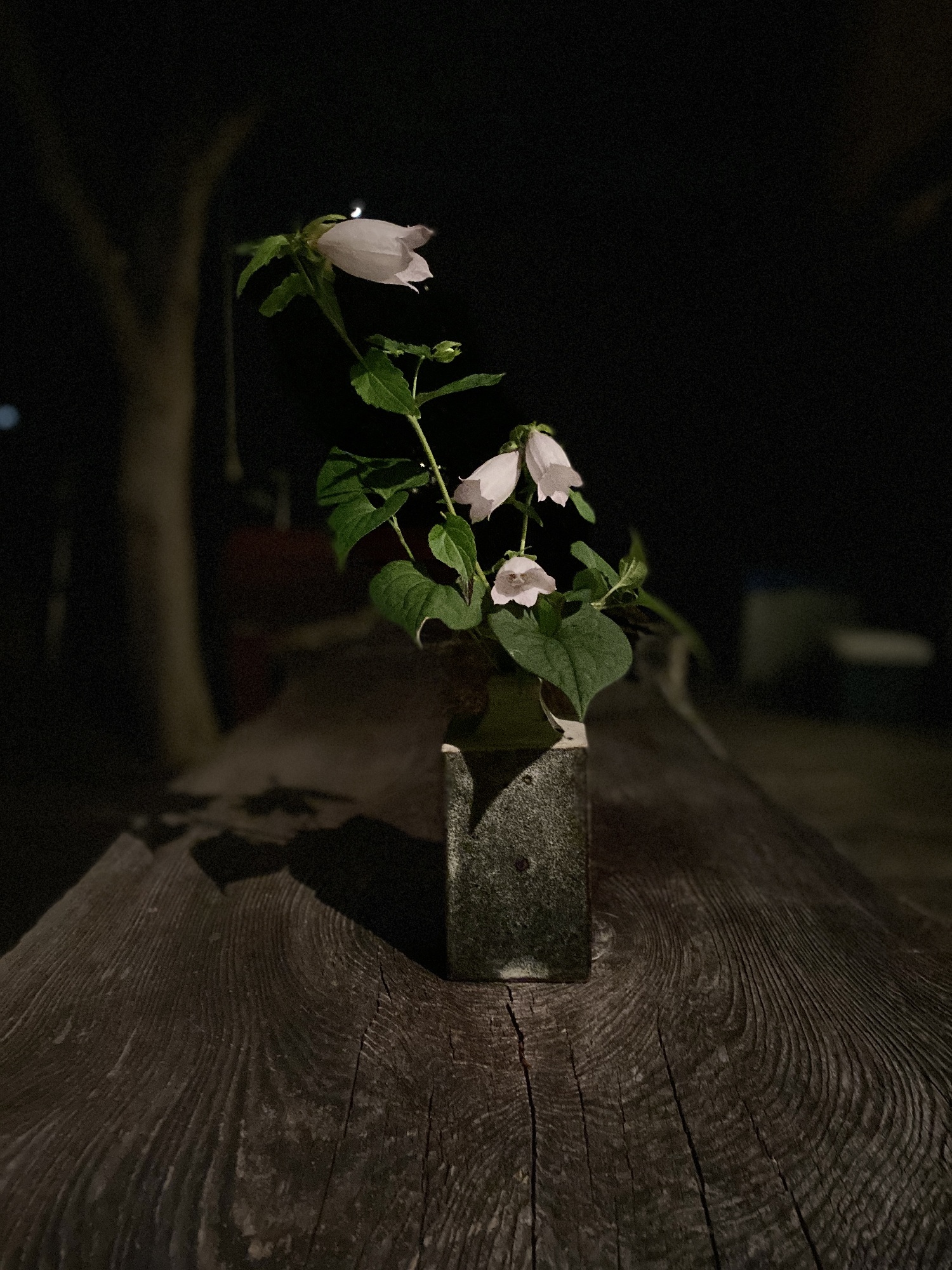 庭に咲いたほたるぶくろとどくだみの葉をなげいれで