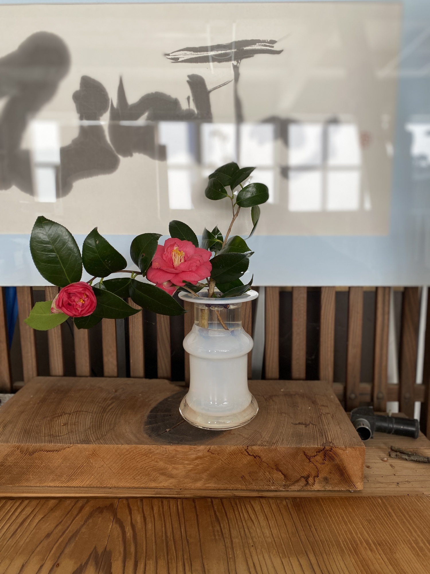 ガラスの白い器に椿の赤と葉の緑が映えます。