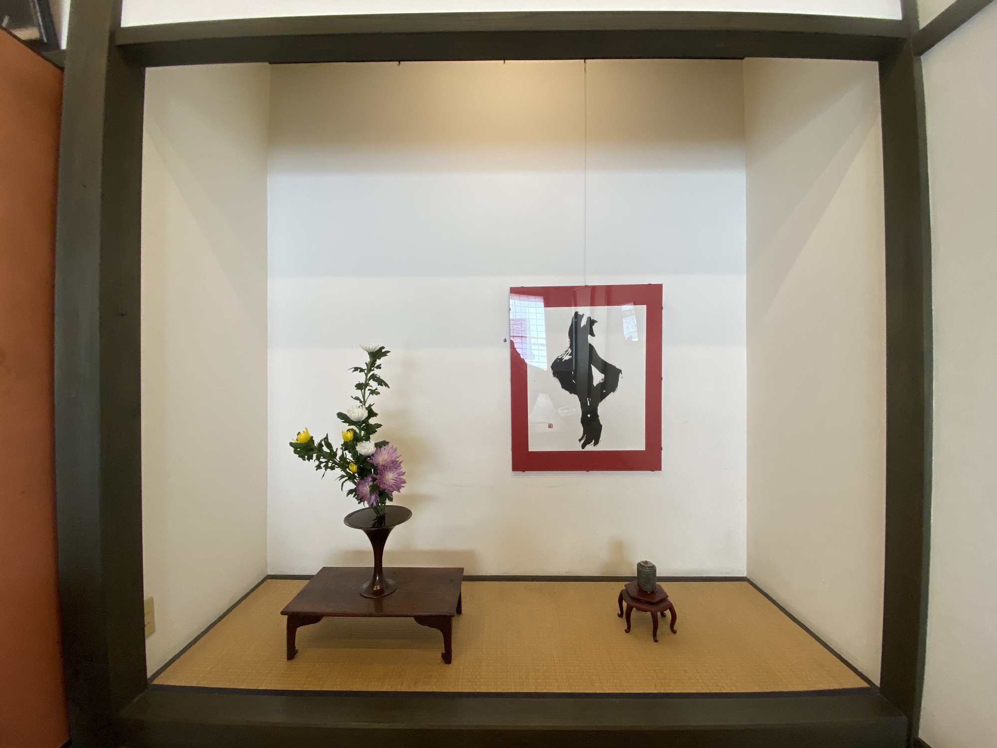 香炉と書と花。
