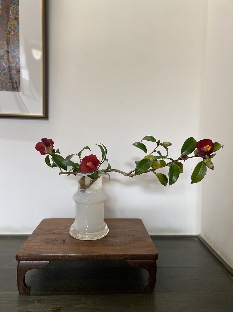 ボラポラスクリスタルの花器にやぶつばきをなげいれで生けました。
