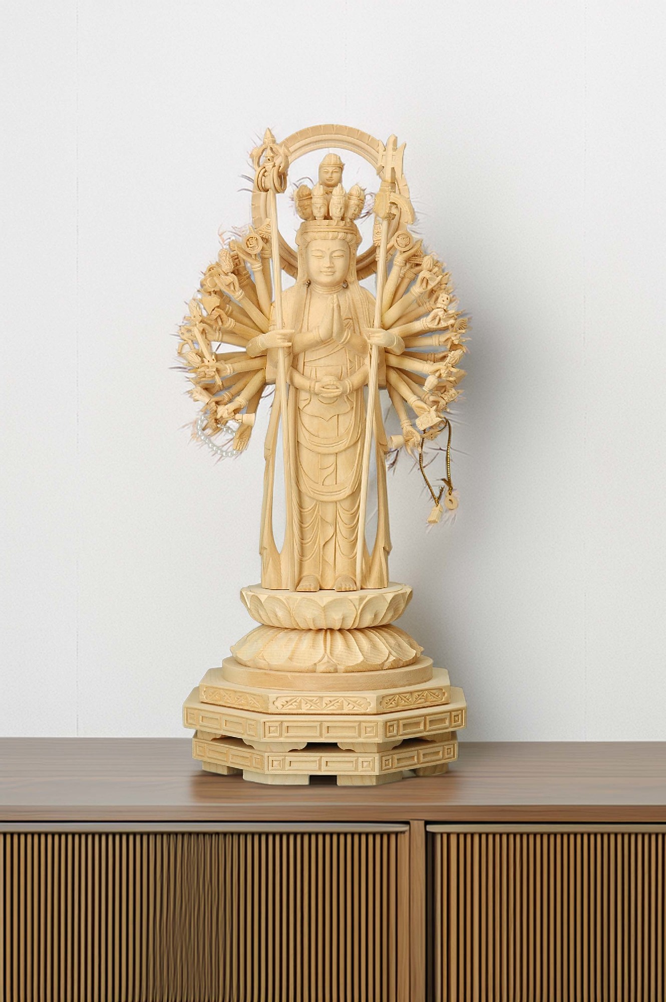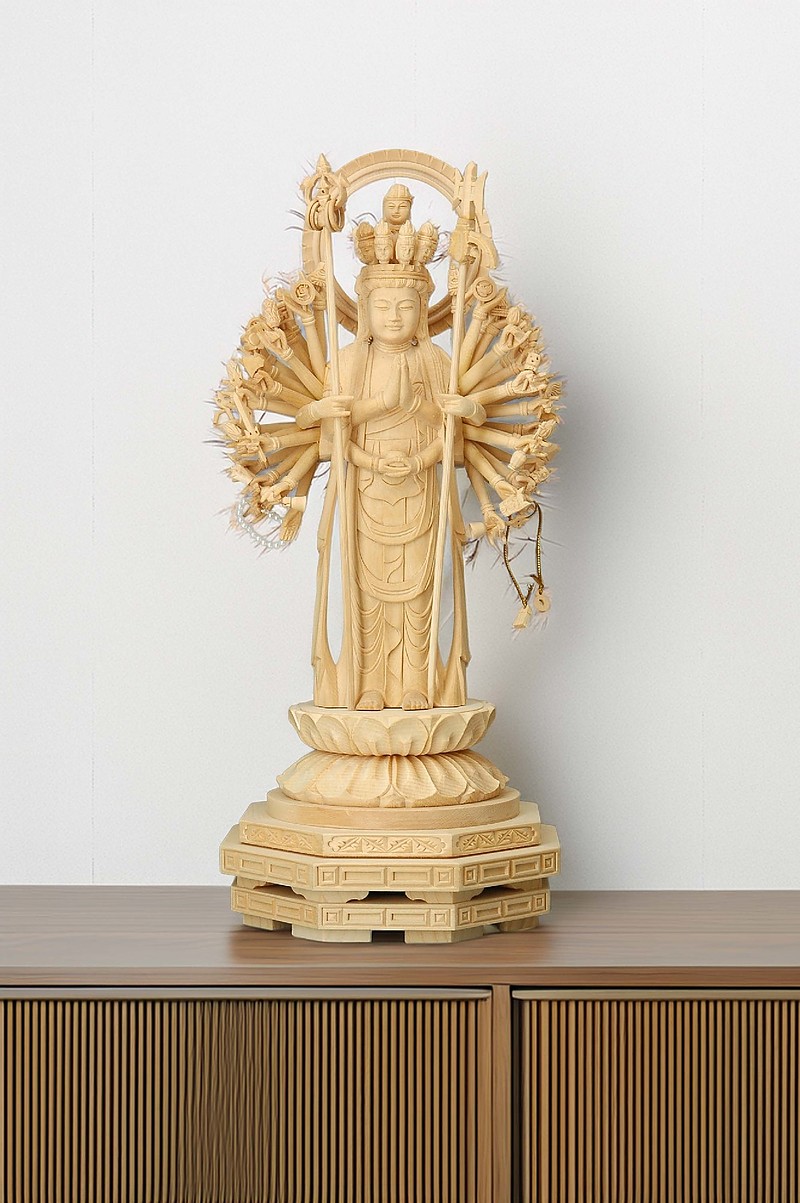 ご家庭のご本尊としてはもちろん、ご先祖への祈りや日々の安らぎを願う心の拠りどころとしてもふさわしいお姿です。静かに佇む千手観音像は、見る人に安心感を与え、自然と手を合わせたくなる存在となります。