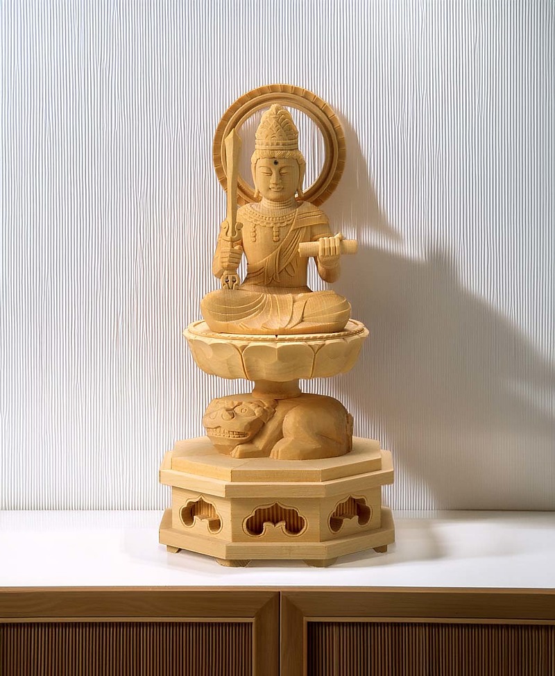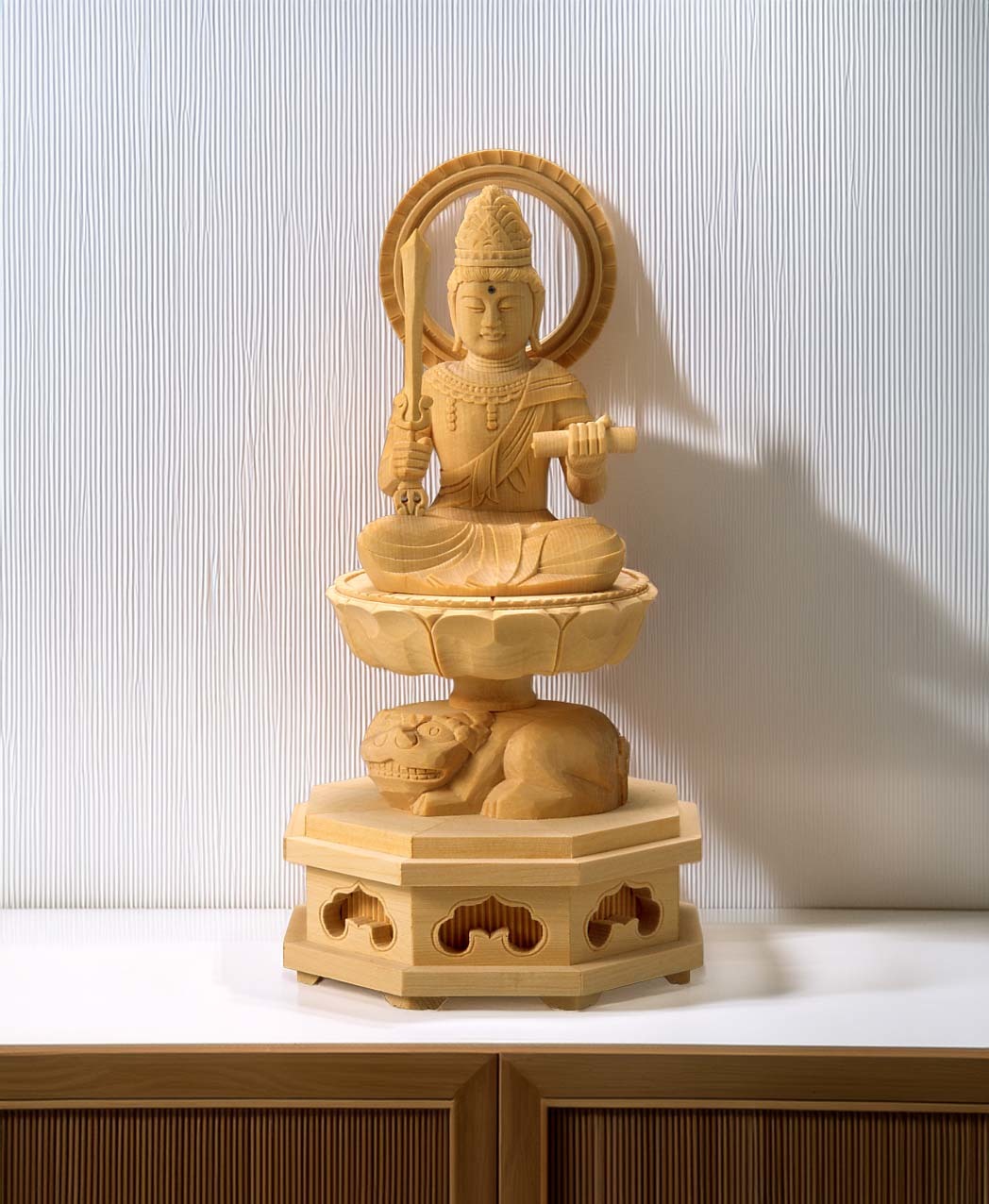 右手の剣、左手の経巻、そして獅子の上に坐す姿は、まさに智慧を授ける象徴。ご家庭でのご安置はもちろん、学業成就や心のよりどころを求める方にふさわしいお像です。