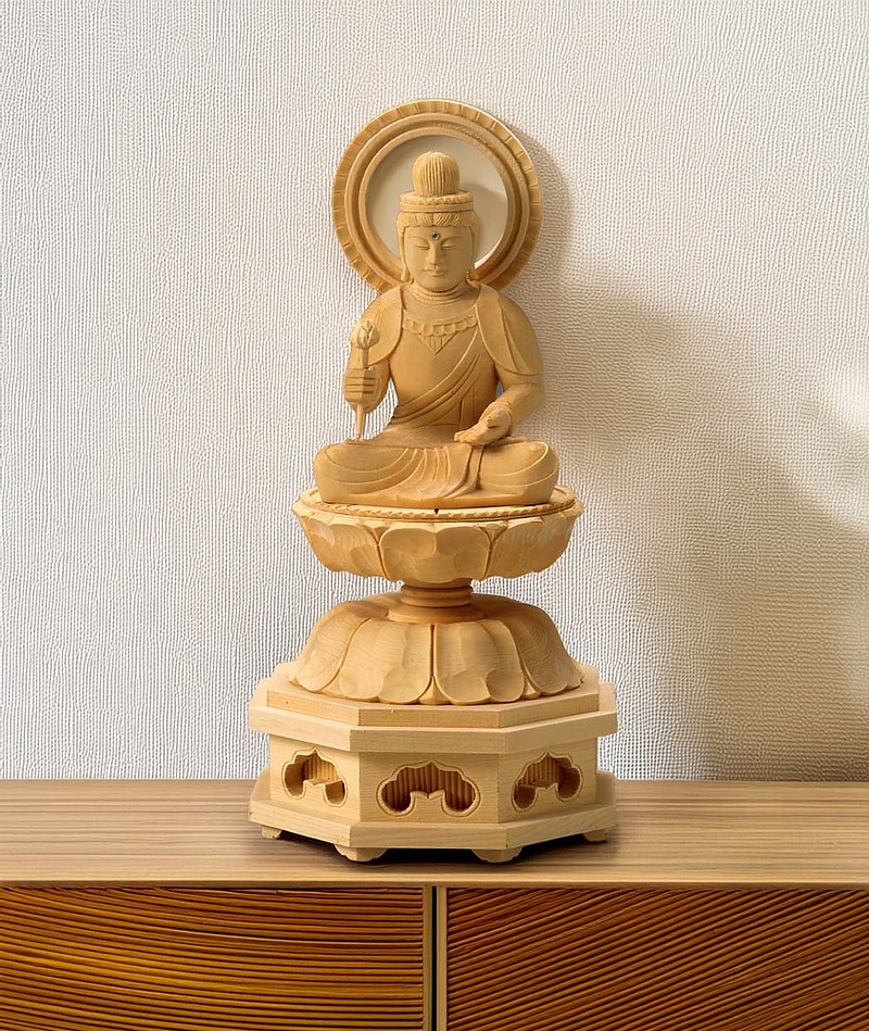 その滑らかな木肌と上品な淡色が、勢至菩薩の穏やかな表情をいっそう引き立て、見る者の心に安らぎを与えます。