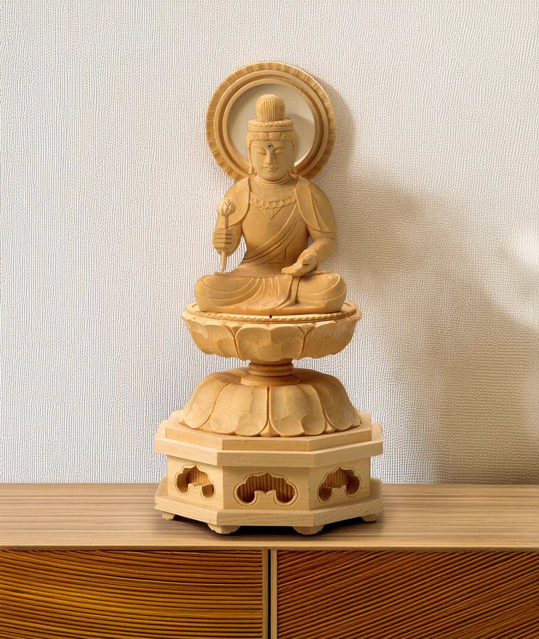 そのお姿は、穏やかな面差しの中に確かな意志を感じさせ、頭上には「智慧の光」を象徴する宝冠を戴きます。