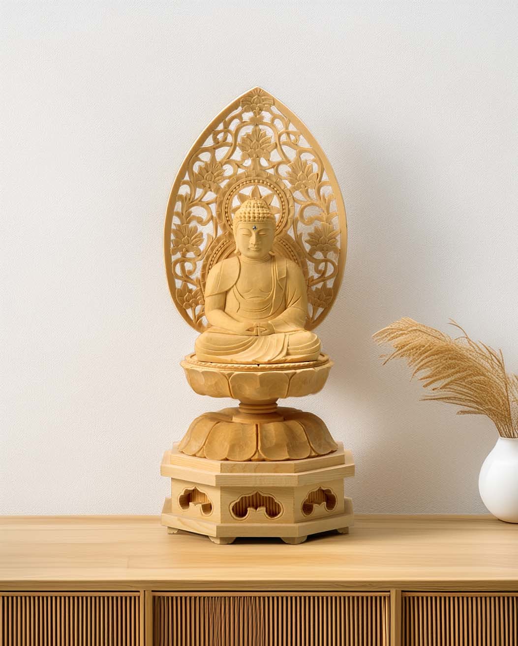 木の香りとともに、手を合わせるたび心が整い、穏やかさが戻ってくるような、一家の中心にふさわしい阿弥陀如来像です。
