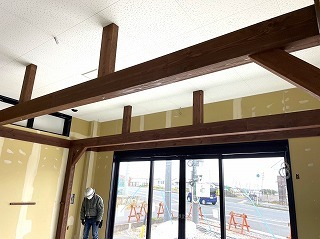 磐田市で、車屋さんの新店舗のガレージ内に木製の装飾用化粧梁を取り付けるリフォーム