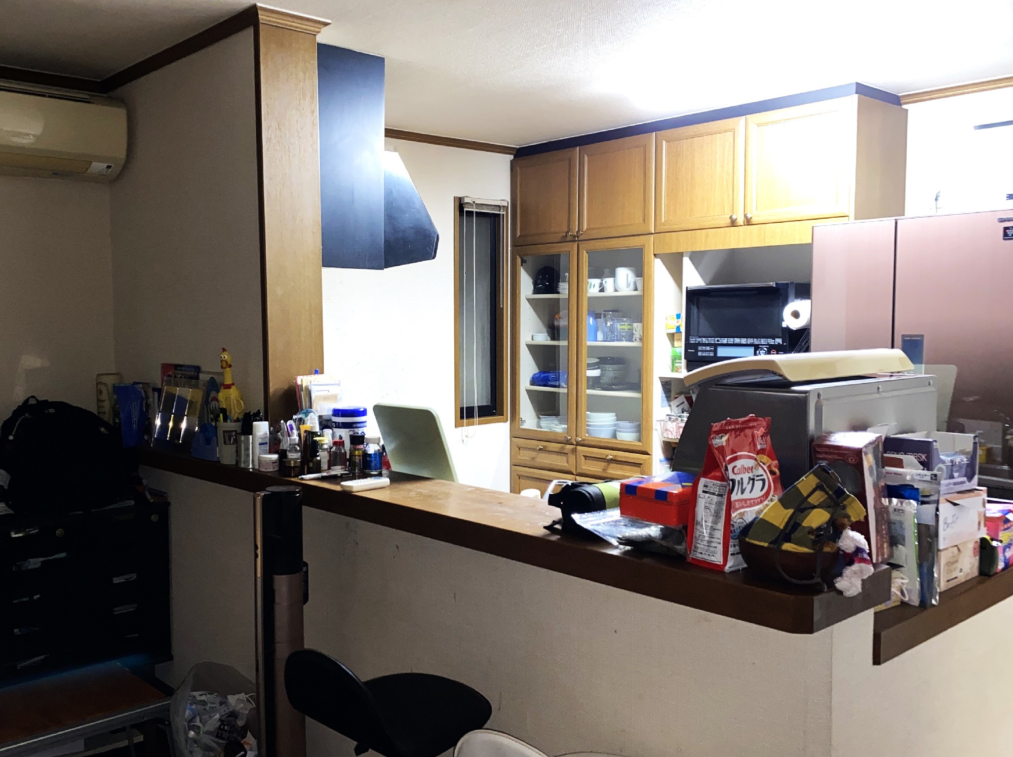 リフォーム前のLDKのキッチン部。レンジフードが付いている壁は解体・撤去します。