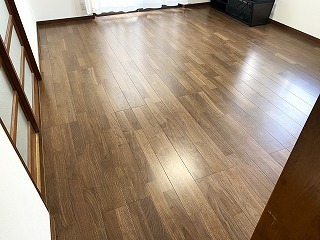 既存のフローリングの上に重ね貼りして張り替えた、リフォーム後のLDKの床。