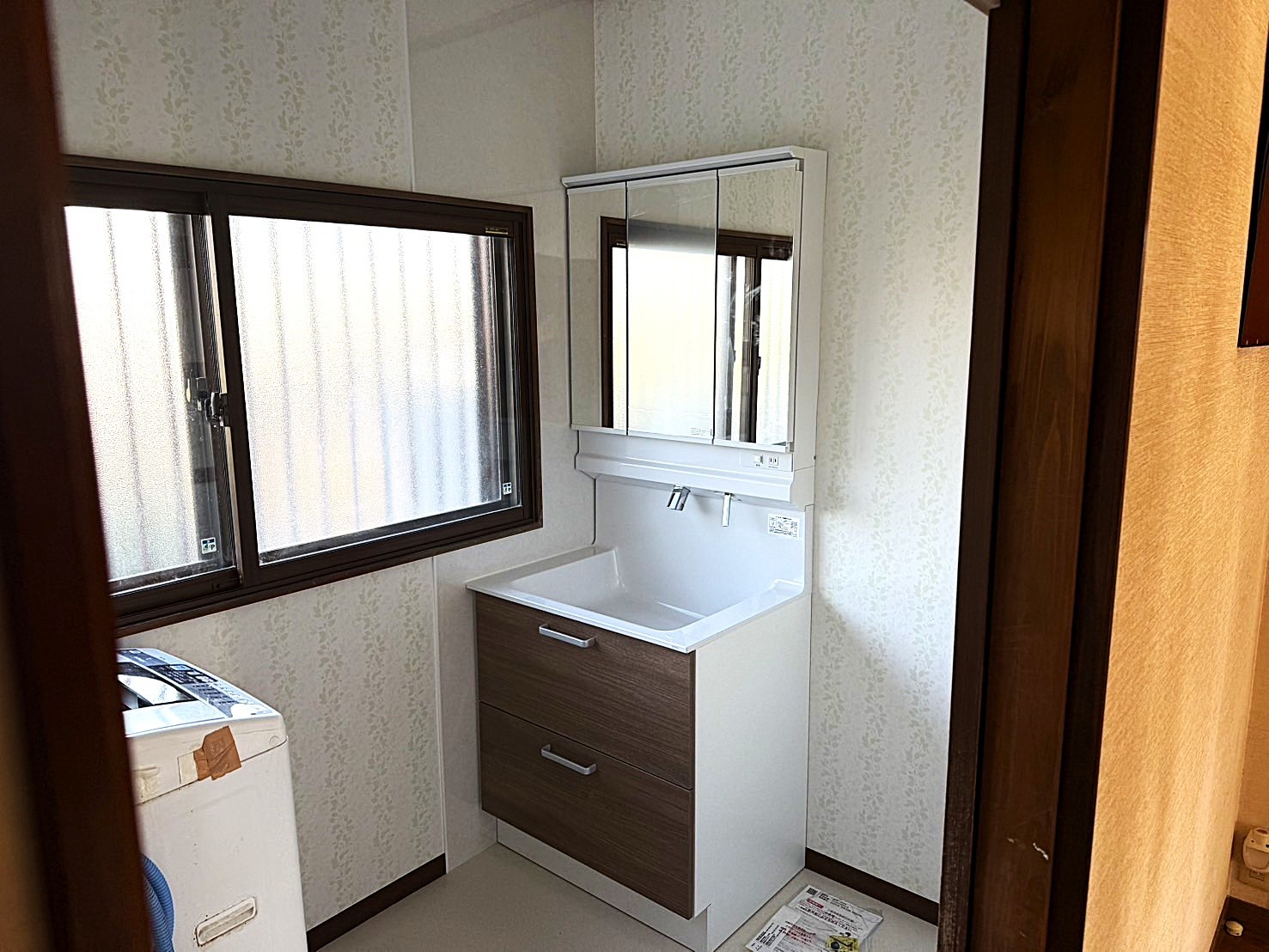 磐田市のお宅で、前回ご紹介した浴室のリフォームと一緒に隣の洗面所の洗面化粧台を取り替え