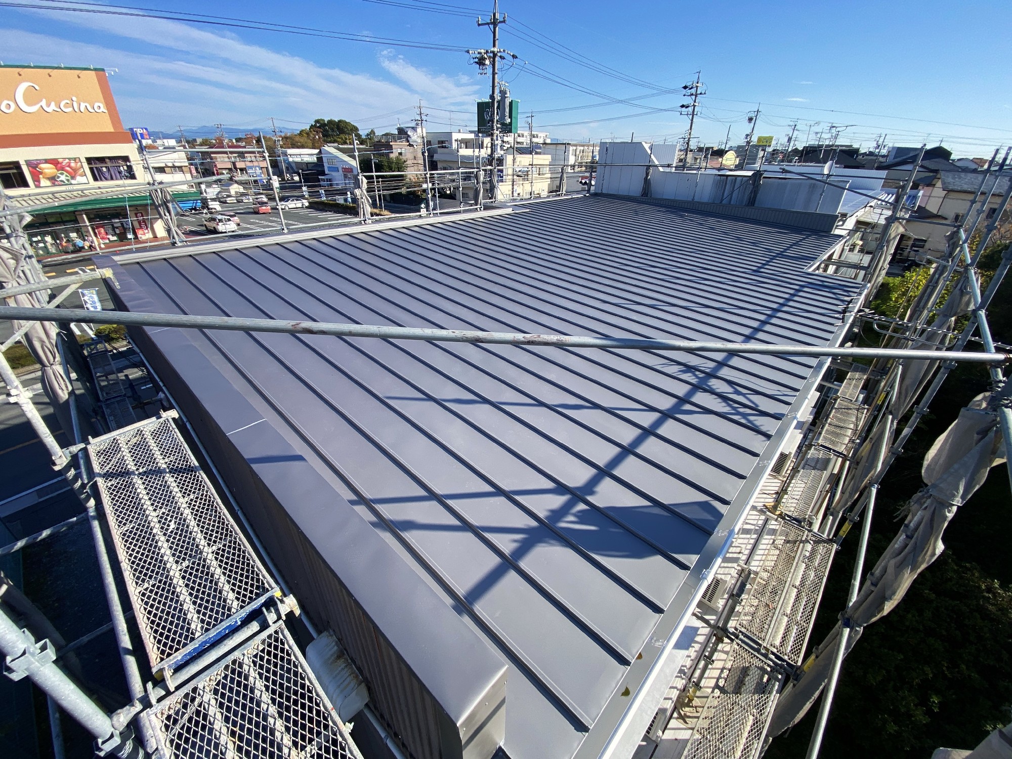 カバー工法で下地から作り、ガルバリウム鋼板で葺いたリフォーム後の桟葺き屋根。