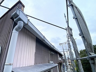 新しい鼻隠し板にガルバリウム鋼板の板金を巻いて角樋を取り付けたリフォーム後。