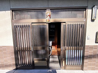 取り替えリフォーム後の、カバー工法で1日で4枚建ての引戸サッシになった玄関。