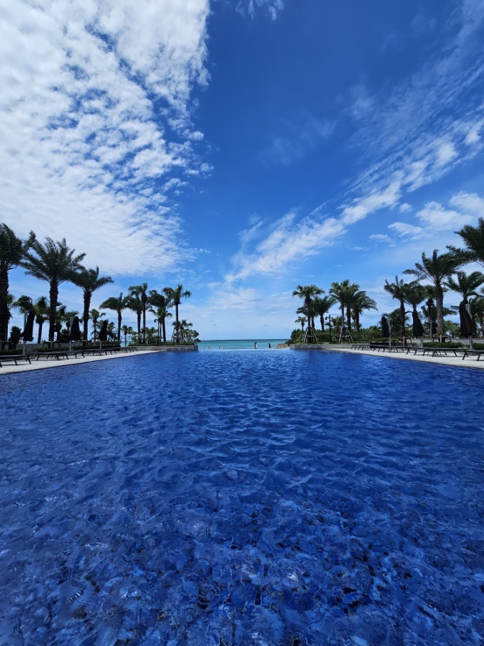 売りは全室オーシャンビューのテラス付き。沖縄県最大のプール面積。6個もプールがあります。室内プールもキレイ。目の前の海はプライベートビーチになっています。