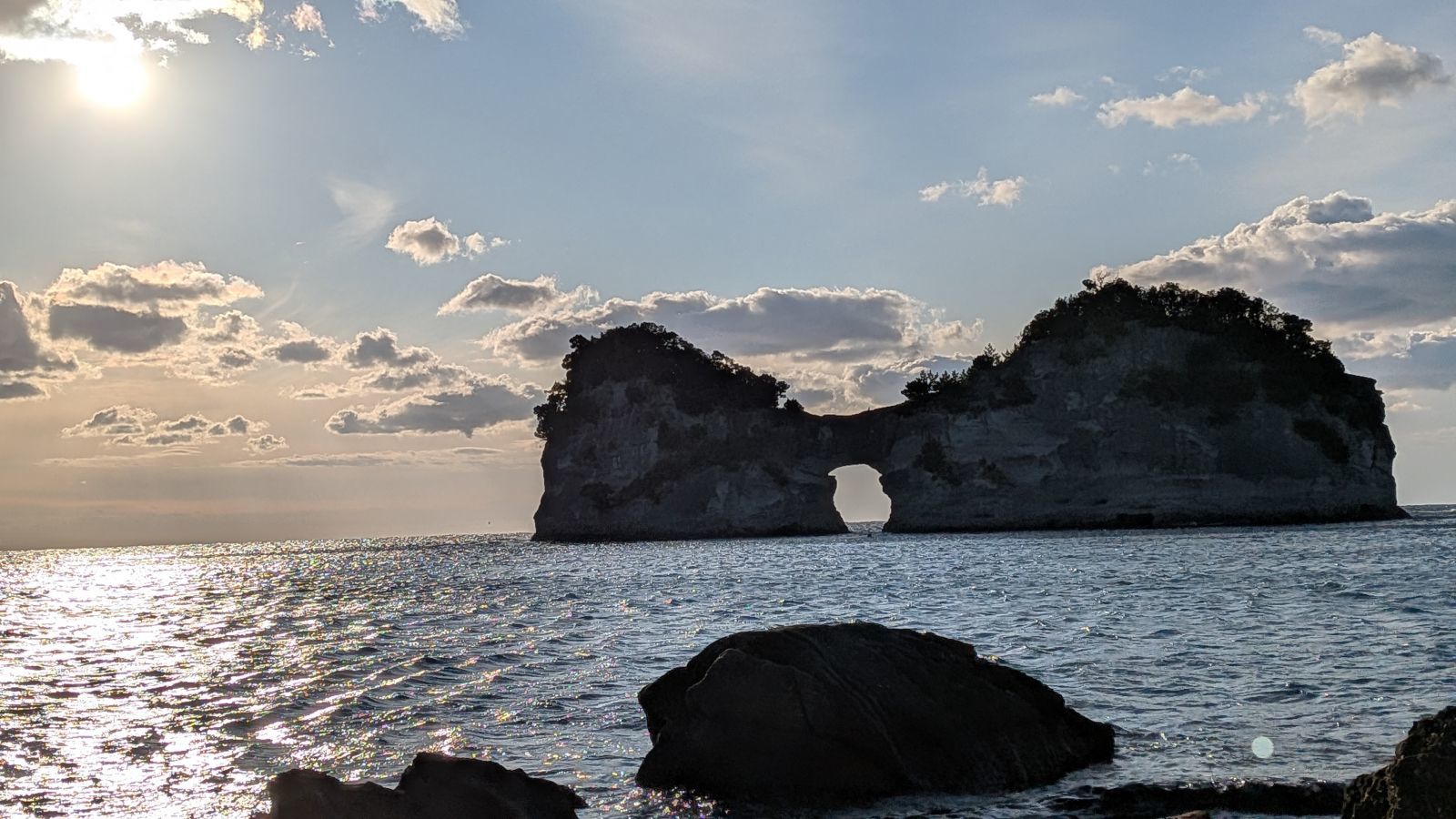 ↑ 円月島 『日本の夕陽百選』に選ばれていて春・秋