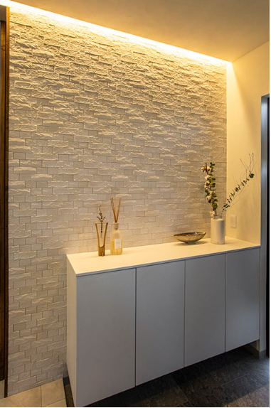こちらにも玄関正面にアクセントパネルを採用すると、印象的な空間とすることができます。