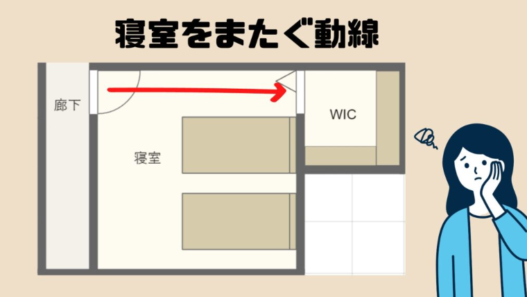 まず、動線の問題については、一度寝室を経由してから、クローゼットに入る必要がありますので、動線が長くなってしまいます。
