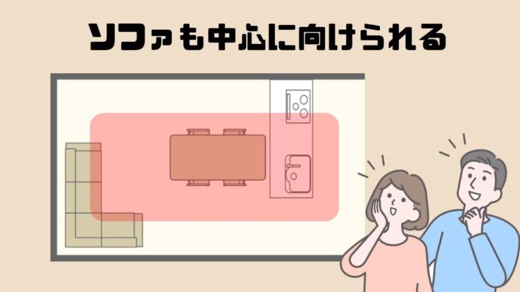 リビングをTVに向ける必要が無ければ、ダイニングやキッチンに向けて、リビングをオープンに配置することができます。そうすることで、LDK内のどこにいても家族が向き合って過ごすことができます。
