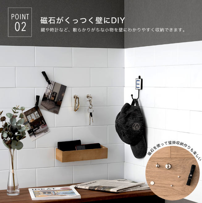 小さなパーツを一つ一つタイルのように施工できるため、マグネットを使用したい箇所だけに、施工することもできますし、インテリアとしてアクセントに使用することもできます。