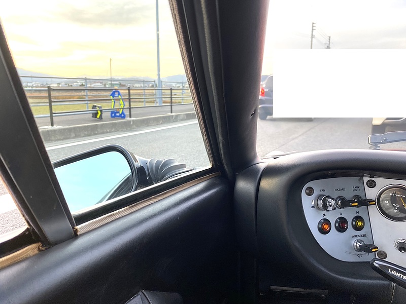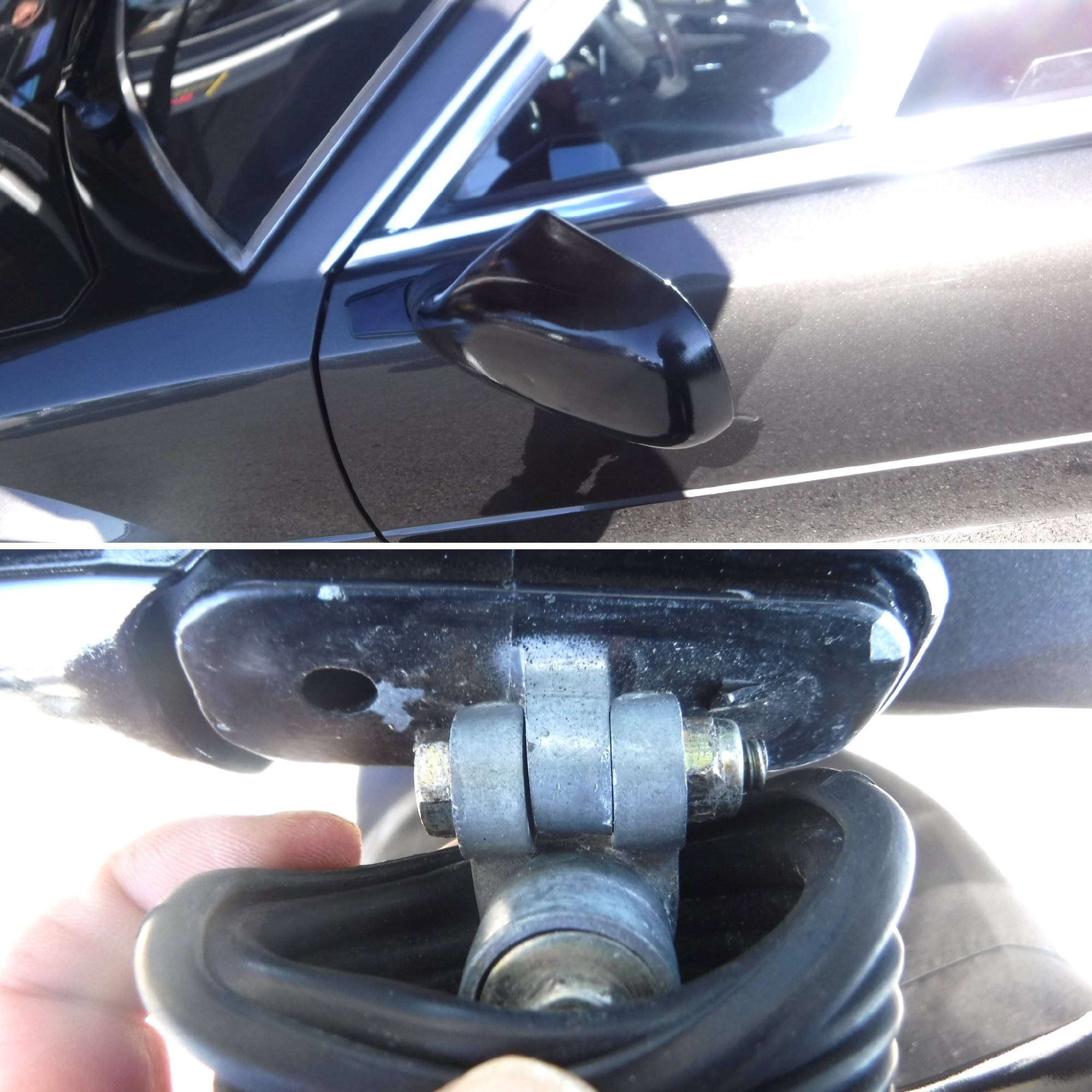 納車後しばらくしてお客様から送られてきた画像には、ぐにゃっと曲がったドアミラーが…。