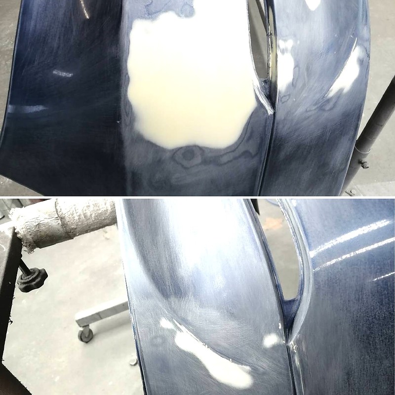 まずは傷周辺をしっかり研磨し、変形部分にパテ処理を施します。