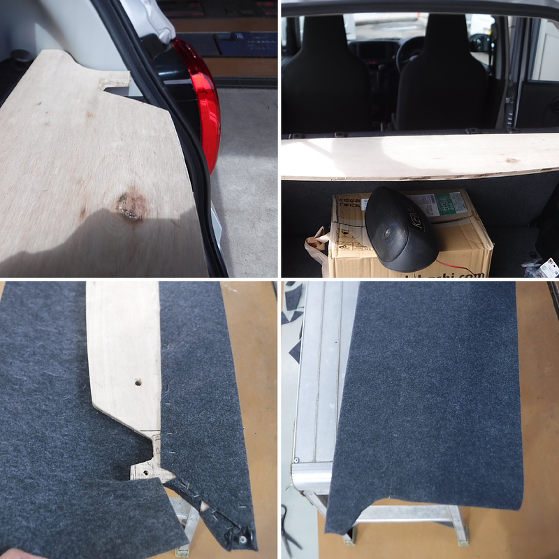 純正のがラゲッジボードないため、当社で一から木製ベースをカット・加工し、グレーのカーペットで丁寧に仕上げたオリジナルラゲッジボードを作成しました\(^o^)/