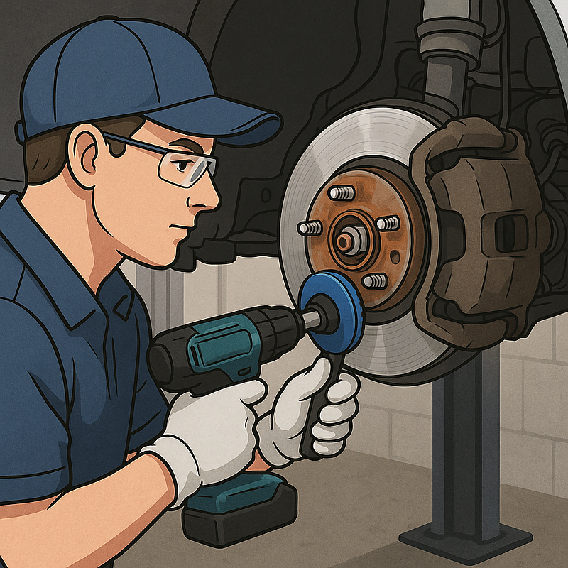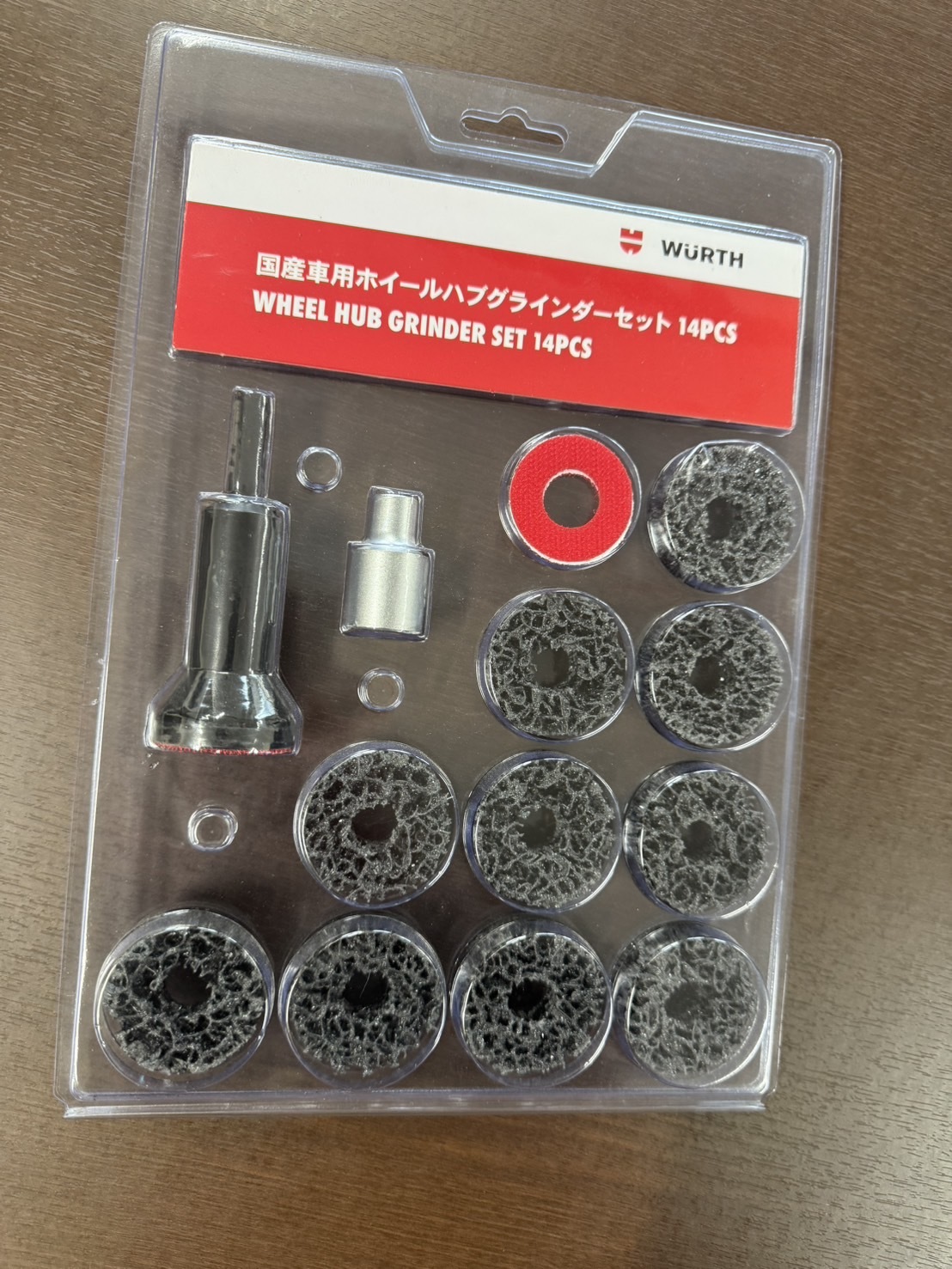 加えて、当社ではWÜRTH(ウルト)製の専用ホイールハブグラインダーを導入し、ハブ表面やスタッドボルト周辺に付着した錆・汚れを高精度で除去しています(*´ω`*)ノ