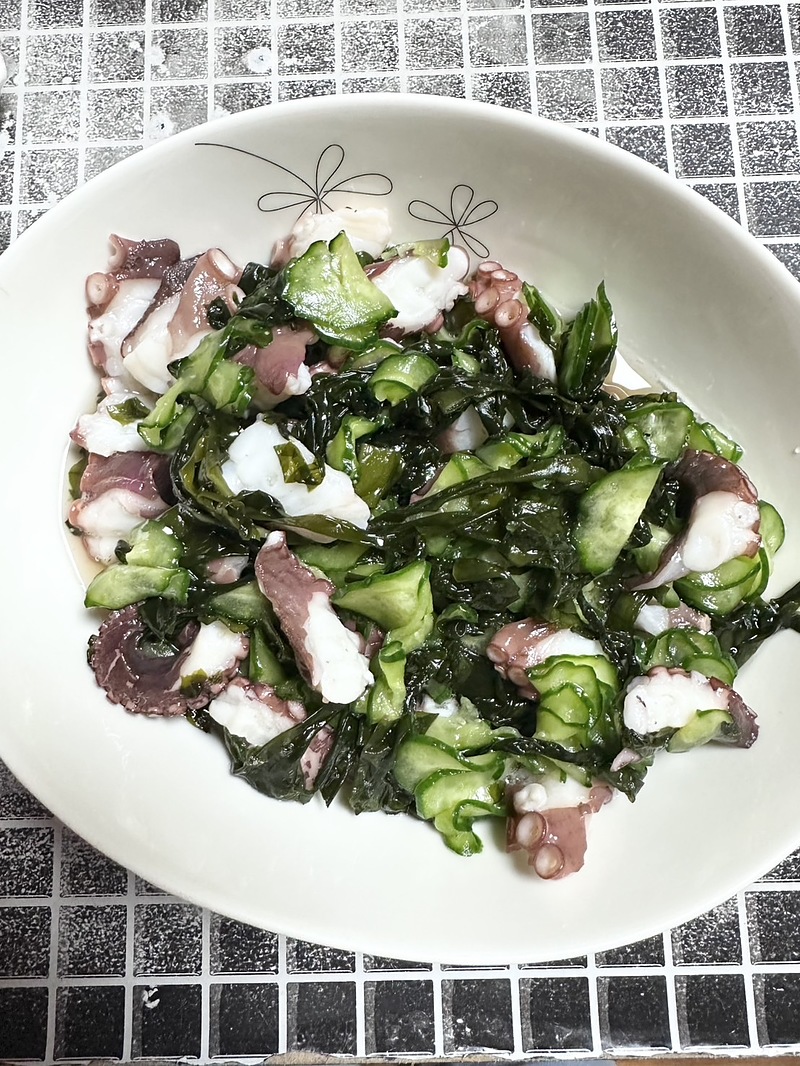 私がきゅうりを切って塩もみして絞り、わかめを洗って~