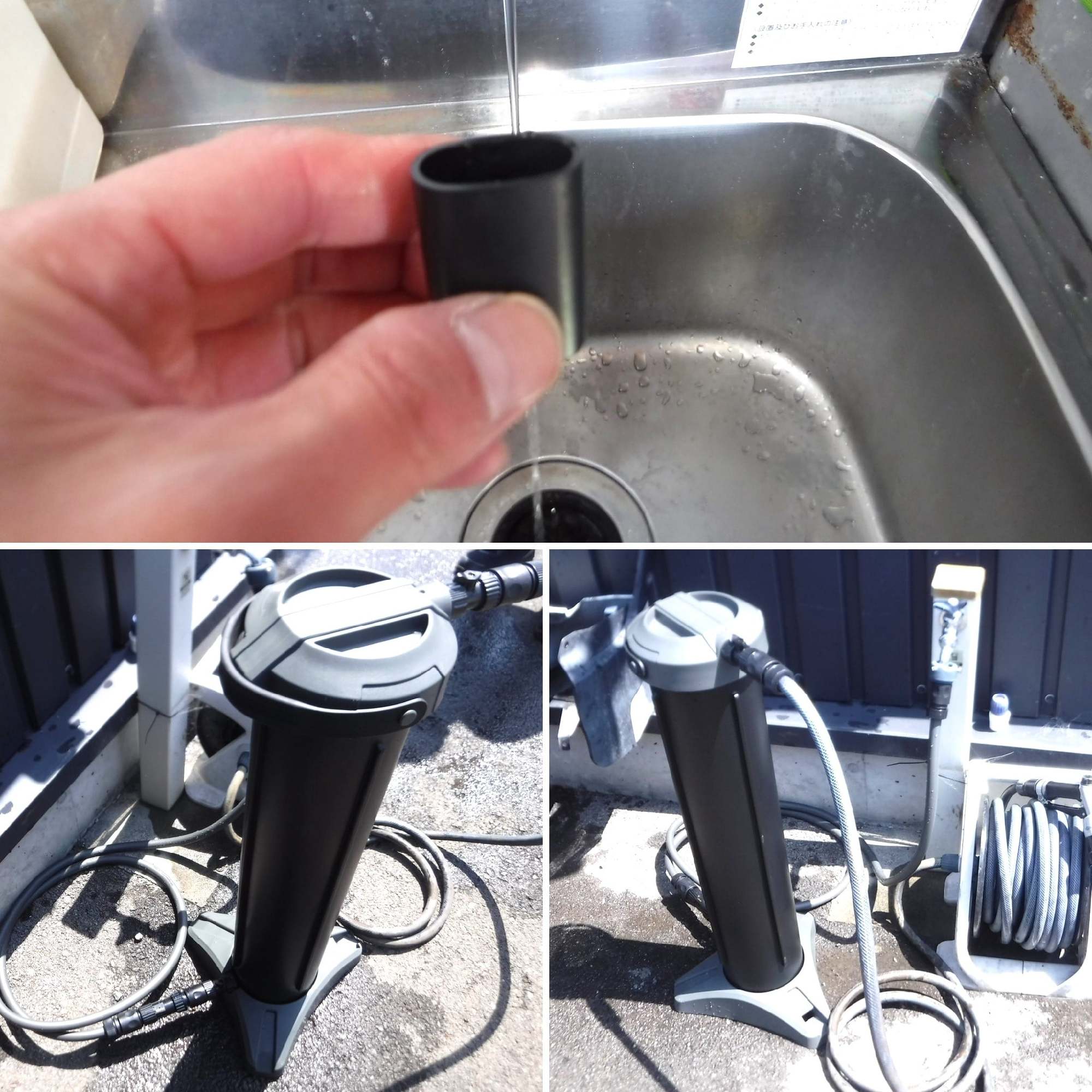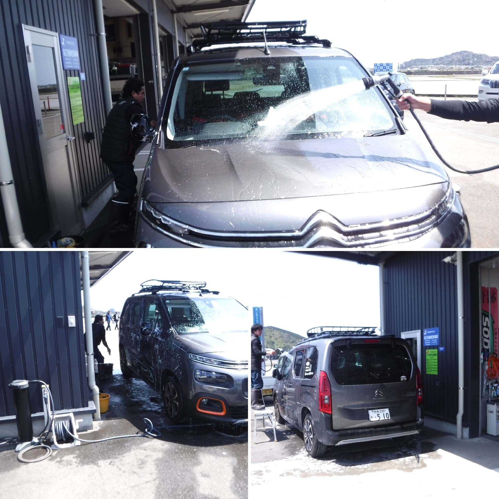 画像は、高速道路を走行し、前面は虫だらけ、さらに雨にも打たれて汚れ放題だったシトロエン・ベルランゴを、純水を使用して手洗い洗車している様子です(^^♪