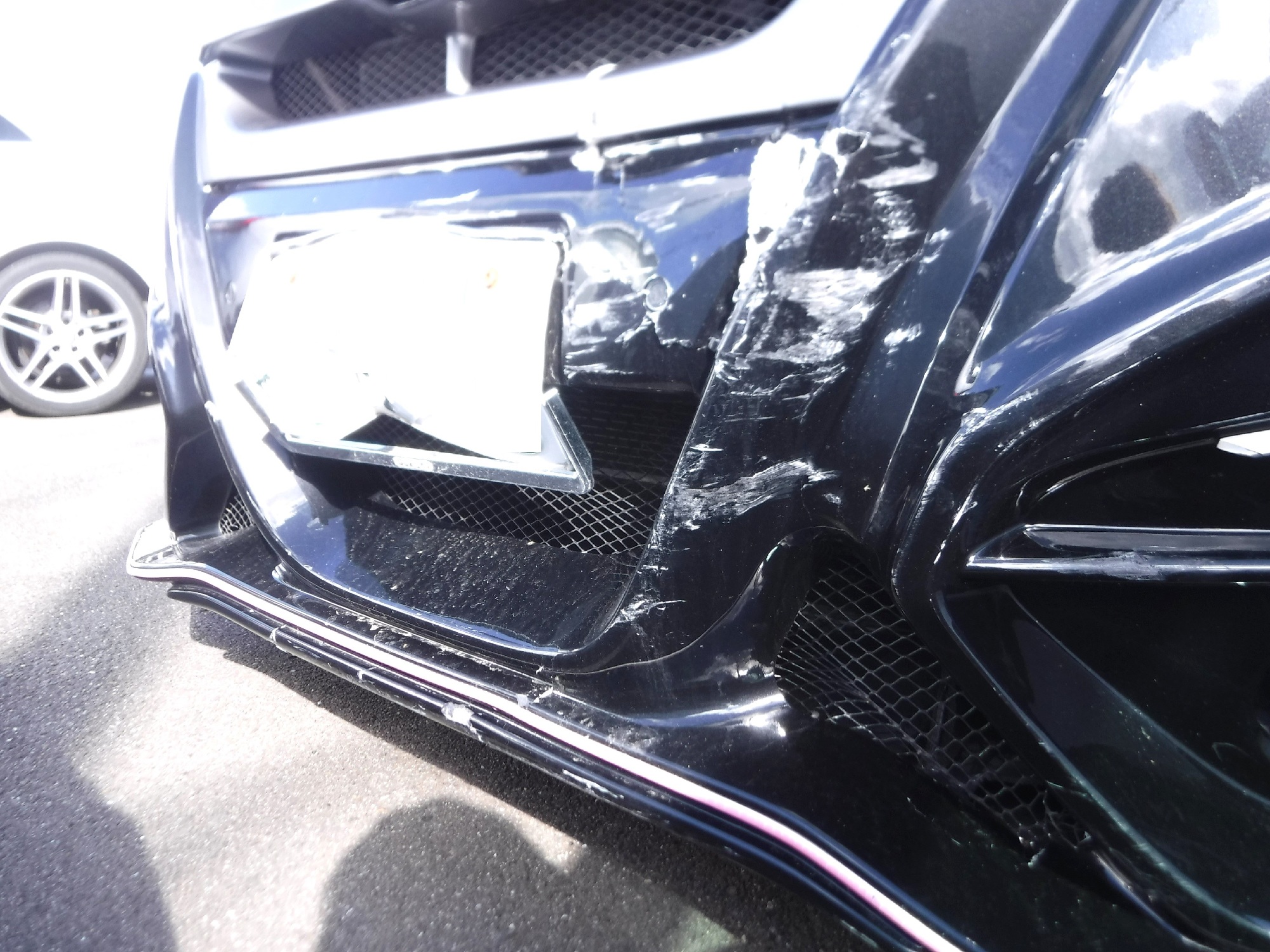 衝突により、ナンバープレートが大きく曲がり、バンパー全体が押し込まれた状態。グリル周辺にも変形が見られました。