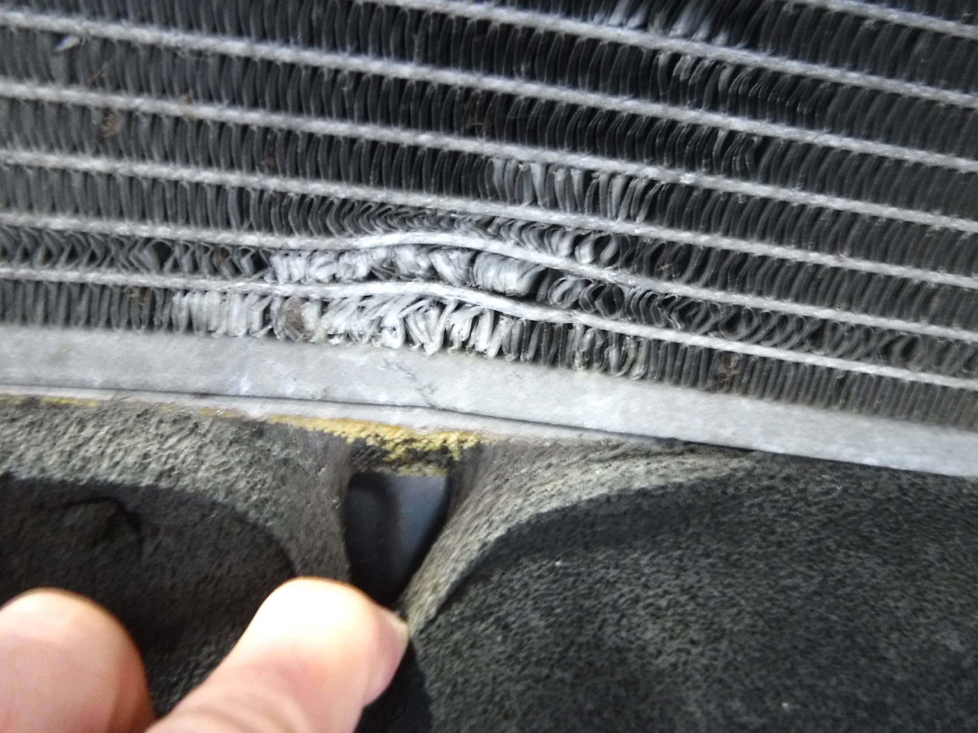 ■コンデンサー損傷 冷媒ラインのコンデンサーにも波打ち状の変形が見られ、これも要交換。