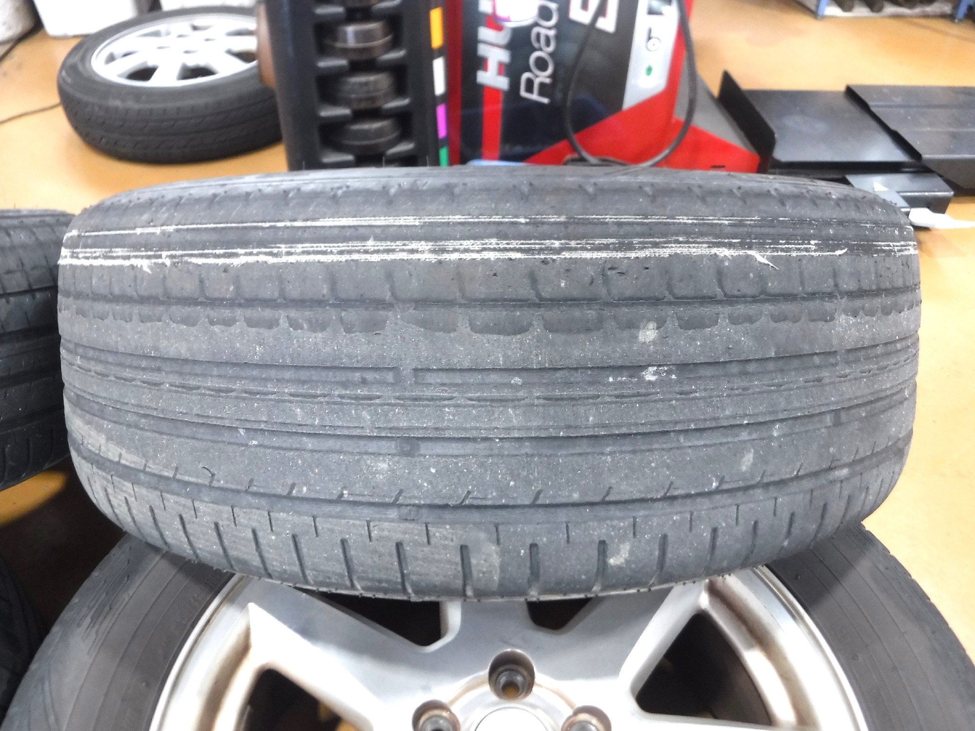 トレッド面が完全にスリック化し、内部のワイヤー(スチールベルト)が露出。大変危険な状態のため即交換しました(^o^)丿