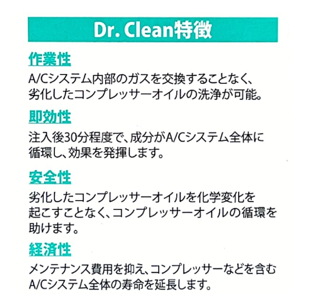 Dr.Leakの特徴は、他の漏れ止め剤とは異なり、専用設計された特殊配合によりシステム内で固着や目詰まりを起こさず、エアコン性能を維持したまま漏れを補修できる点です。