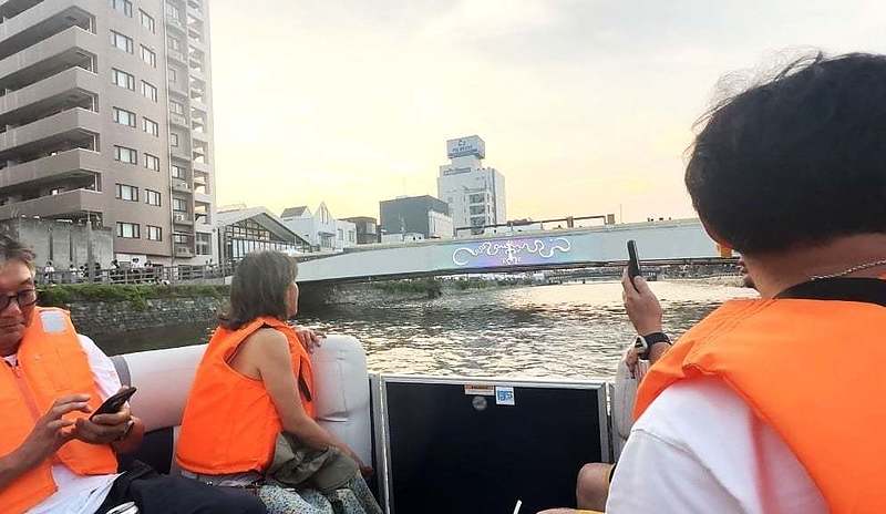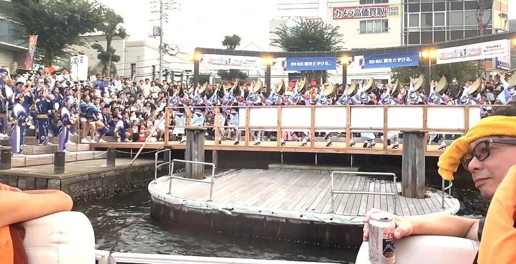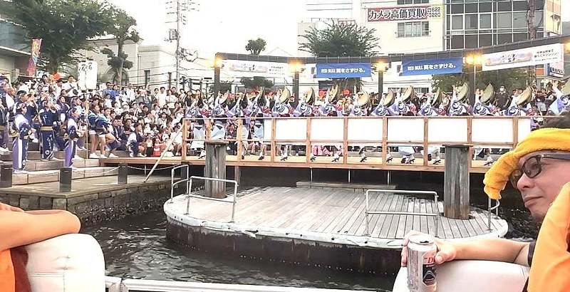 道中でちょうど空いていたクルーズ船に乗ることができ、阿波踊りが行われている街中を船の上から眺めました。