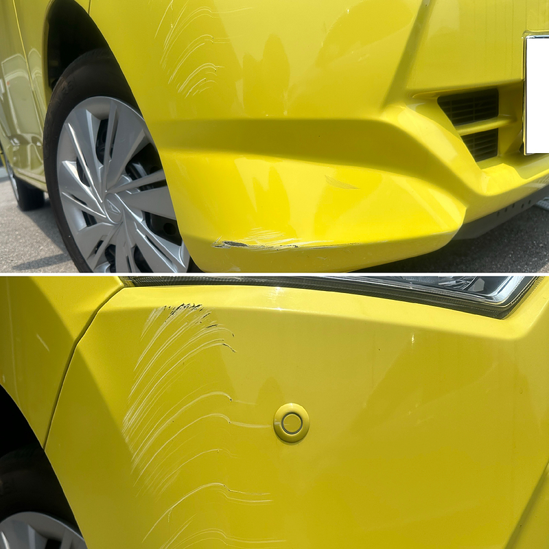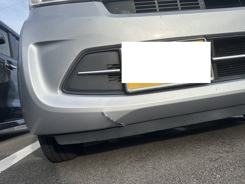 フロントバンパーに擦り傷が入ってしまいましたが、割れは無かったため修理で対応しました。