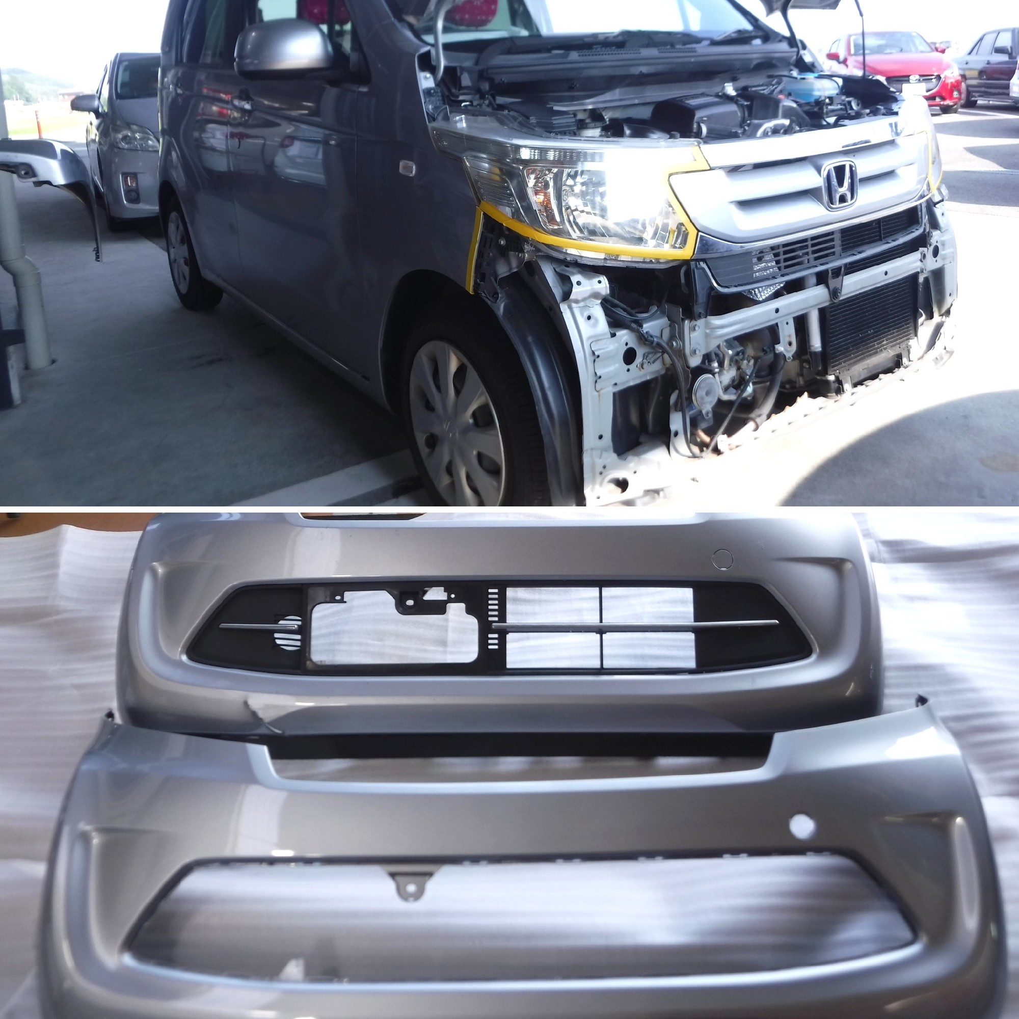 こちらはフロントバンパーが割れてしまい、修理も可能ではありますが、色付き新品バンパーへの交換と費用差が大きくないため交換でまとまりました。