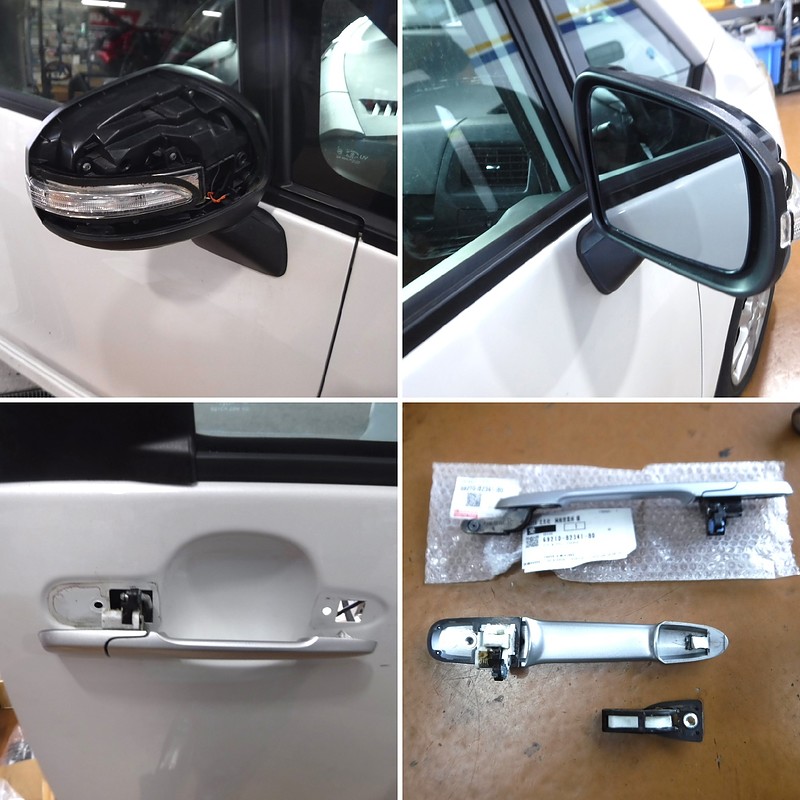 次にムーヴ。こちらは約15年前に新車販売したお車で、すれ違いざまの軽い接触によりミラーのカバーが外れ、後方ドアのアウターハンドルが割れてしまっていました。
