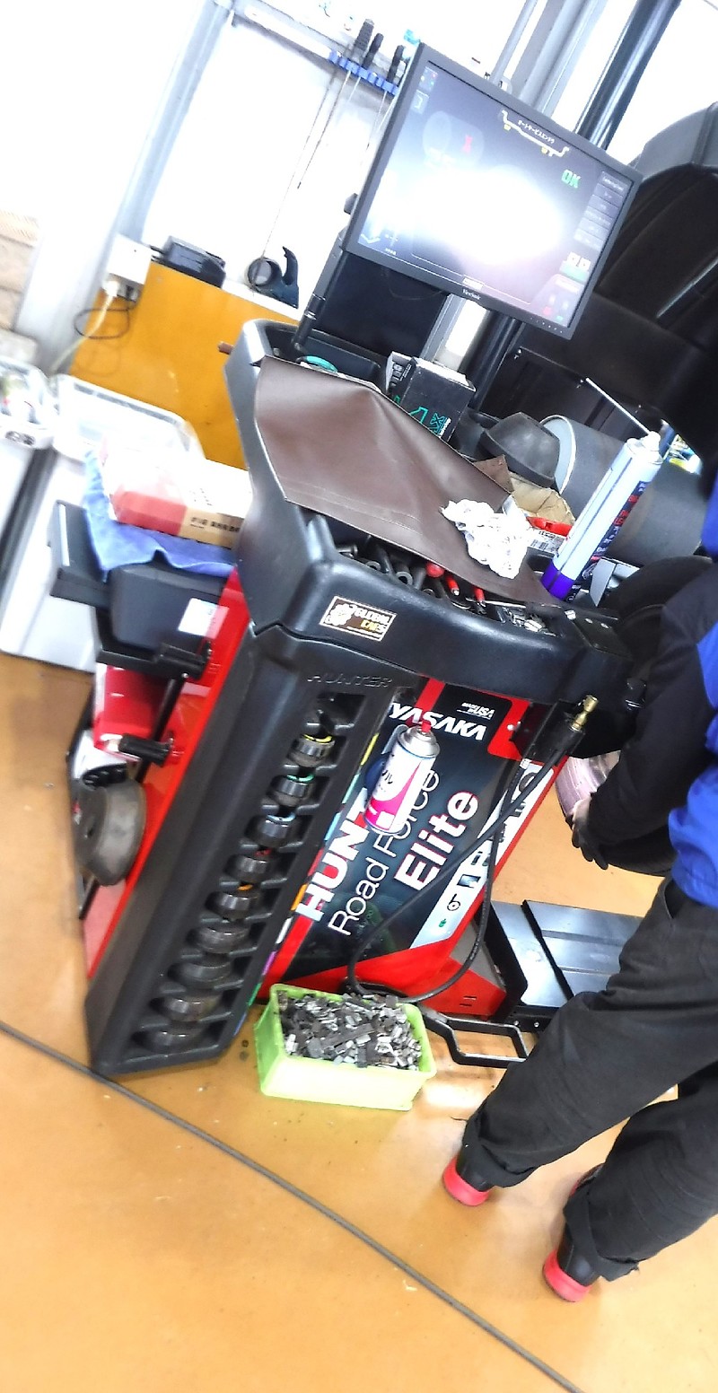 写真はタイヤローテーション後にホイールバランスを調整している様子です。