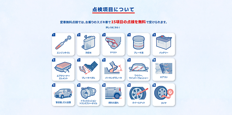 無料点検の内容 スズキの無料点検は15項目で構成され、エンジンルームや足回り、電装系、下回りなど普段では確認しづらい箇所を丁寧にチェックします。