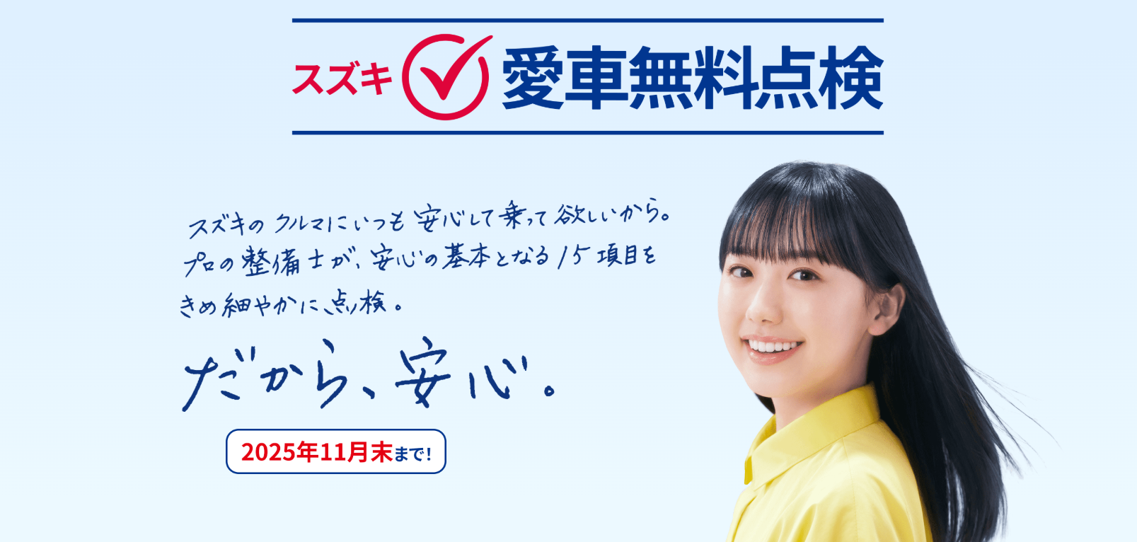 スズキ車は日頃から入庫が多く、今年も無料点検の開始に合わせて多くのご相談をいただいています。