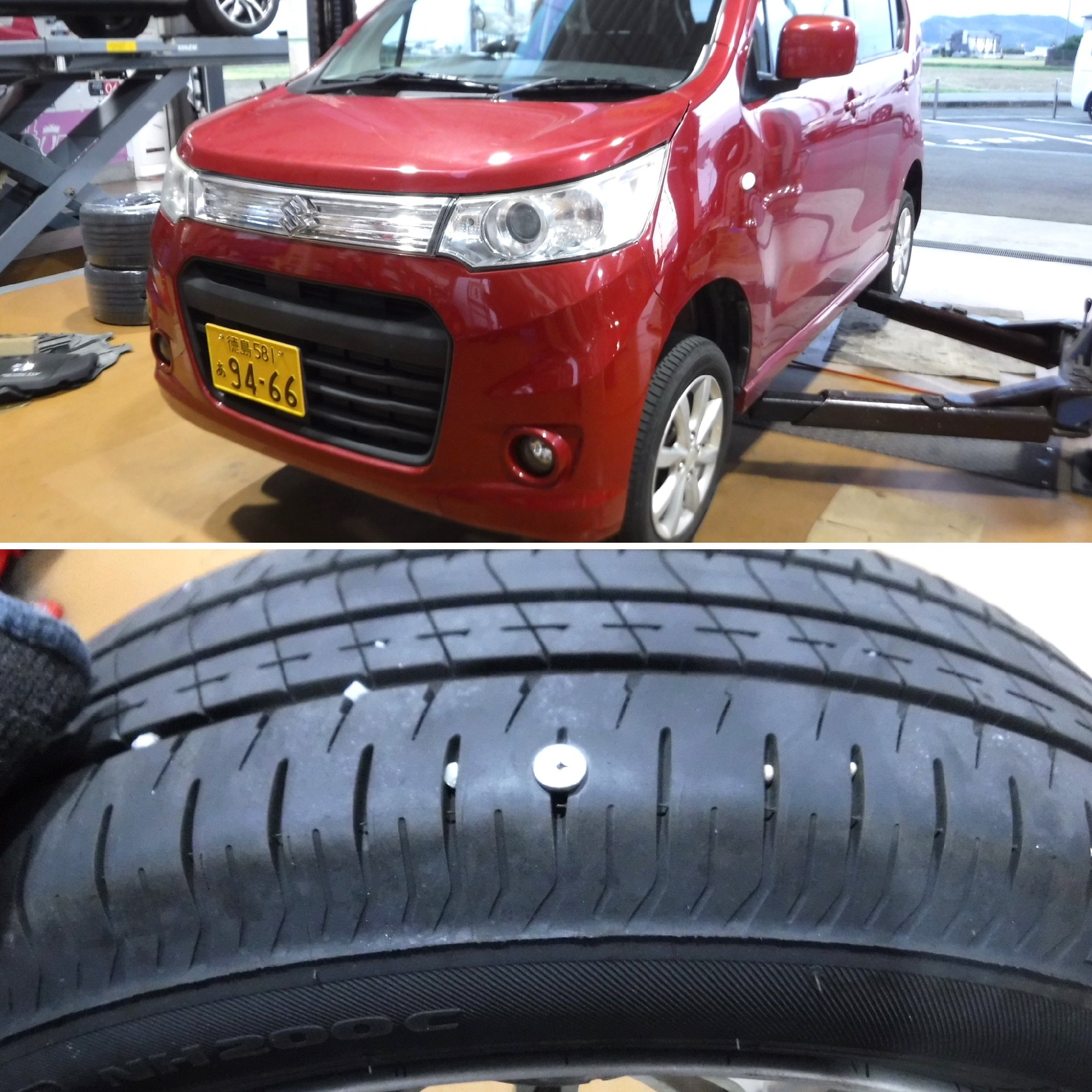 当社管理のサービスカーがビスを踏んでパンクしていました。点検中に発見でき、すぐに修理を行いました (^_^;)