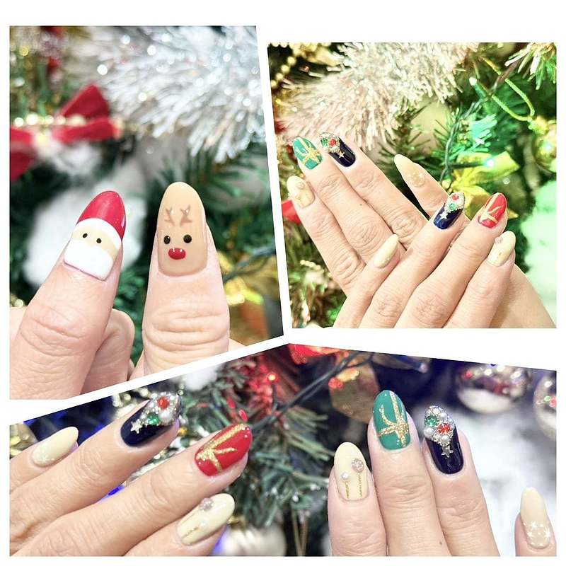 ネイルは、事前に気になったデザインを共有しており、当日は画像を見ながらサンタやトナカイ、ツリーをどんなバランスで入れるか相談しつつ決定しました。