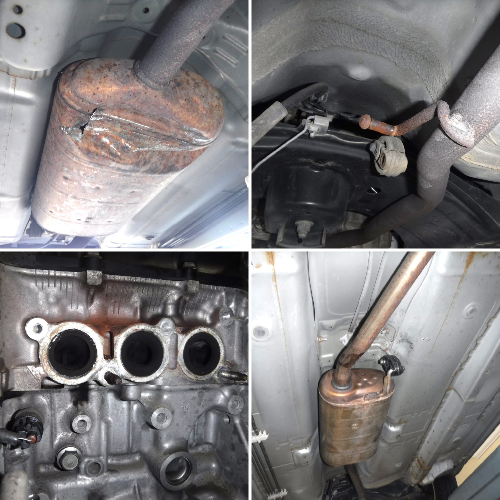 画像のように地面の突起物にマフラーを強くぶつけてしまい、大きく変形していました。