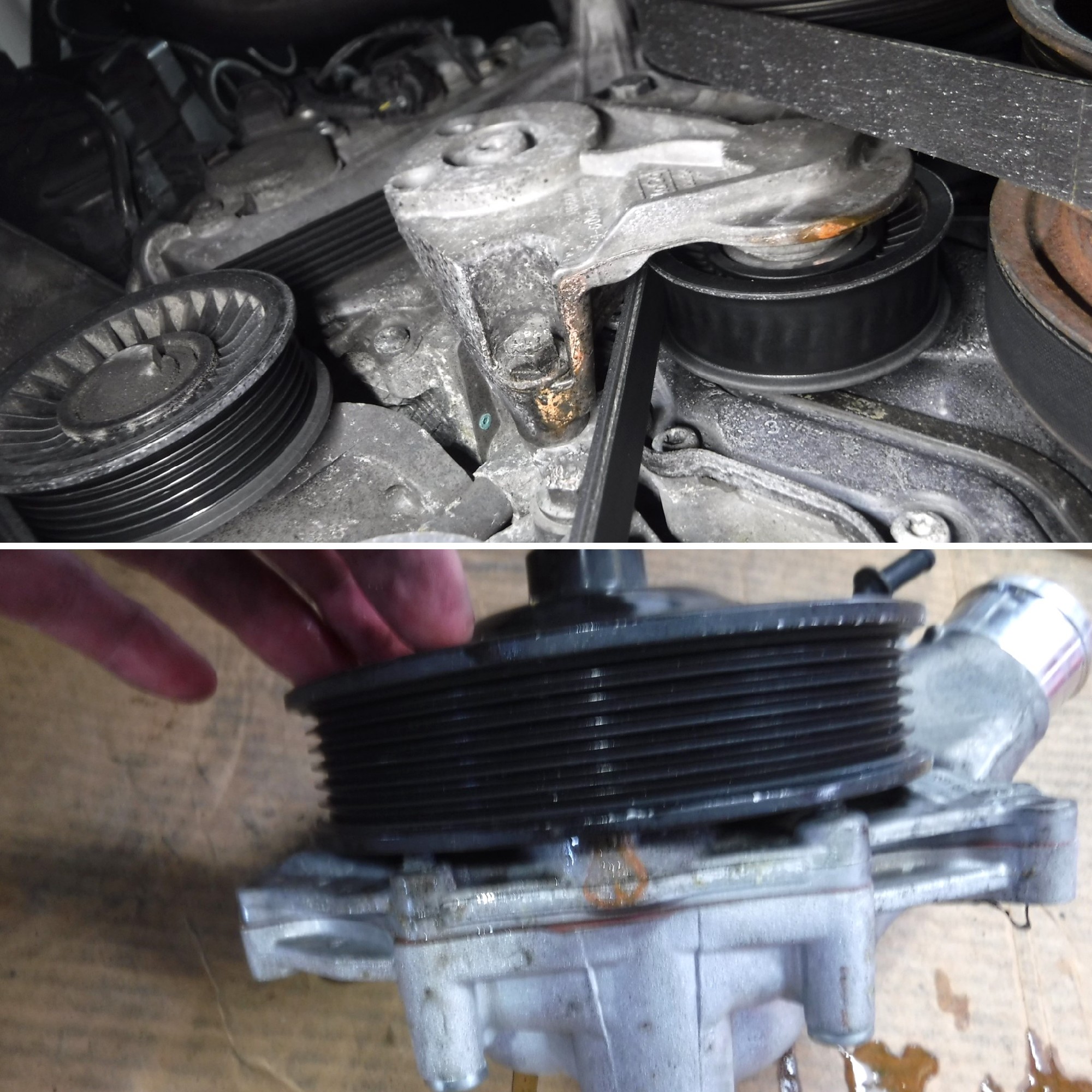 補機ベルト周辺に冷却水の付着跡があり、原因を追っていくとウォーターポンプからの漏れが判明しました。