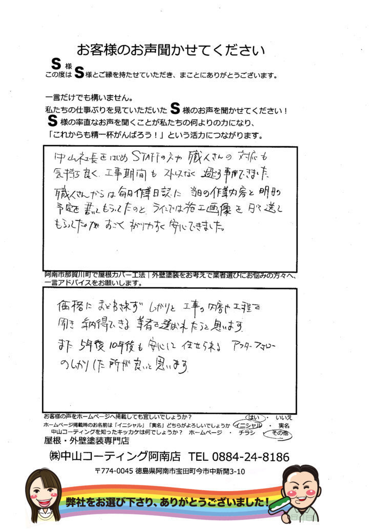 中山社長をはじめSTAFFの方や職人さんの対応も気持ち良く、工事期間もストレスなく過ごす事ができました職人さんからは毎日の作業日誌に 当日の作業内容と明日の予定を書いてもらってたのと ラインでは施工画像を日々送ってもらったのがすごくわかりやすく安心できました。価格にまどわされず しっかりと 工事の内容や工程を聞き 納得できる業者を選ばれたらと思います。また 5年後 10年後も安心して任せられる アフターフォローのしっかりした所が良いと思います。