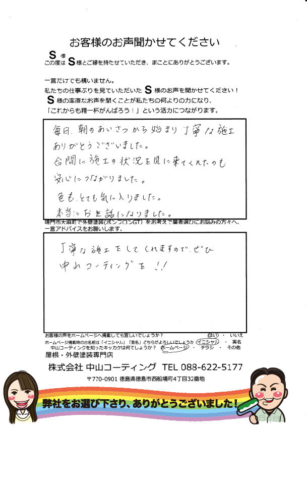 毎日、朝のあいさつから始まり丁寧な施工、ありがとうございました。合間に施工の状況を見に来てくれたのも安心につながりました。色も、とても気に入りました。本当にお世話になりました。新築から外壁色を反対(逆)にして、とても気に入る家となりました。丁寧な施工をしてくれますので、ぜひ中山コーティングを!!