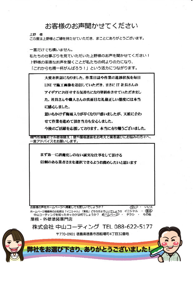 大変お世話になりました。作業日誌や作業の進捗状況を毎日LINEで施工画像を送信していただき、まさにIT社長さんのアイデアにお任せする気持ちになり契約させていただきました。社員さんや職人さんの真面目な礼儀正しい態度には本当に感心しました。思いもかけず梅雨入りが早くなり戸惑いましたが、天候に合わせて作業を進めて頂き当方も安心しました。今後のご活躍を応援しております。本当にありがとうございました。まず第一に誤魔化しのない誠実な仕事をして頂ける、信頼ある業者様を選択できるようお薦めしたいと思います。