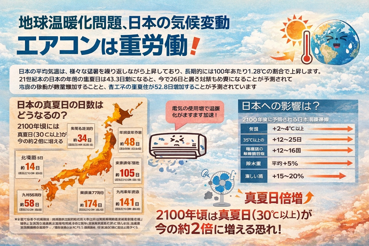 地球温暖化の影響で、日本の平均気温は長期的に上昇傾向にあり、真夏日(最高気温30℃以上)の日数も今後さらに増えると予測されています。猛暑や熱帯夜、豪雨などが当たり前になりつつある今、お住まいの「暑さ・寒さ対策」はますます重要になっています。