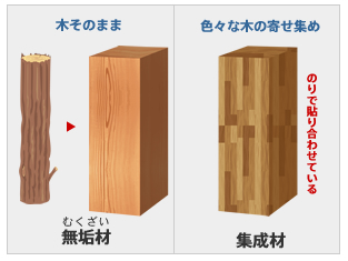 「集成材」とは、小さく切り分けた木材を乾燥させ接着剤で組み合わせた「人工」の木材。