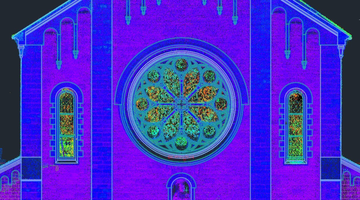 本件では、固定式3Dレーザースキャナーを用いて建物外周を複数点から計測。ミリ単位の精度で取得した点群データにより、外壁形状や開口部位置、装飾要素を三次元的に把握しました。