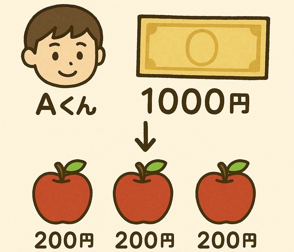 Aくんが1000円持っています。1個200円のリンゴを3つ買いました。お釣りはいくらでしょう。